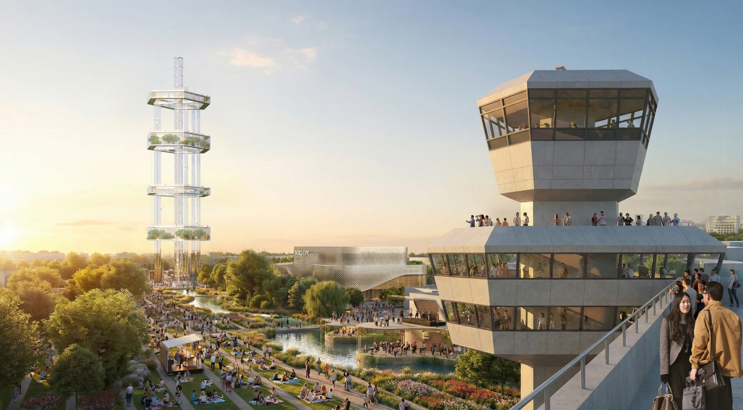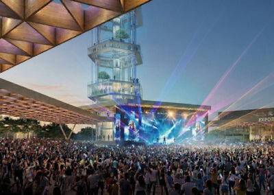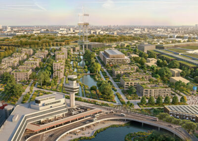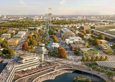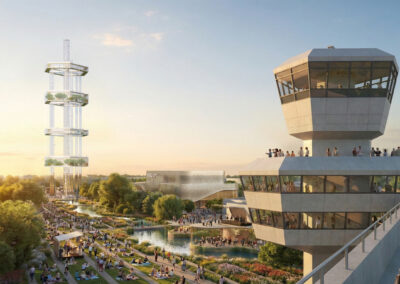 Das städtebauliche Konzept sieht einen offenen, nachhaltigen Campus mit Länder- und Themenpavillons vor, der Austausch, Vernetzung und Wissenstransfer fördert. Ein zentrales architektonisches Element ist die behutsame Transformation des ikonischen Flughafengebäudes: Seine prägnante Struktur und Identität bleiben erhalten und werden zugleich in eine neue Nutzung überführt. Insbesondere die charakteristische Form des Oktagons dient als gestalterische Grundlage und wird in der Anordnung neuer Baukörper zeitgemäß interpretiert und weiterentwickelt.